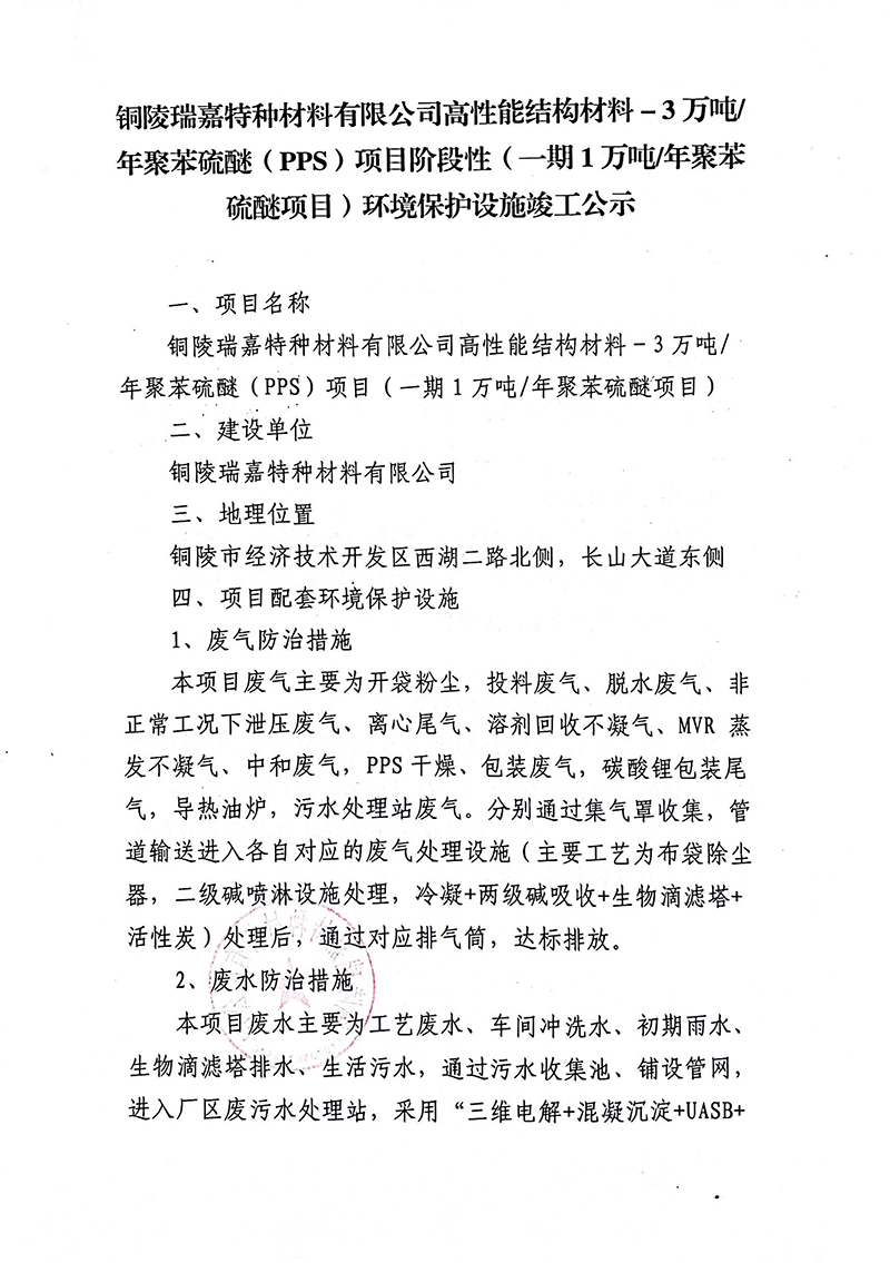 高性能結(jié)構(gòu)材料-3萬噸/年聚苯硫醚(PPS)項(xiàng)目 階段性(一期1萬噸/年聚苯硫醚項(xiàng)目) 環(huán)境保護(hù)設(shè)施竣工公示